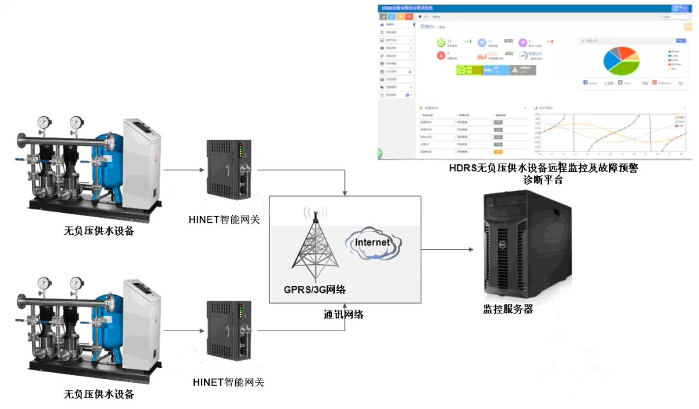 HDRS無負(fù)壓供水監(jiān)控預(yù)警系統(tǒng)由HINET智能網(wǎng)關(guān)、HDRS遠(yuǎn)程通信密鑰及HDRS供水監(jiān)控預(yù)警平臺組成。HINET智能網(wǎng)關(guān)作為HDRS供水監(jiān)控預(yù)警系統(tǒng)的數(shù)據(jù)采集端與變頻控制器中的核心控制器(如PLC)連接,將采集到的數(shù)據(jù)通過GPRS/3G/以太網(wǎng)等方式上傳至監(jiān)控服務(wù)器中,并通過HDRS無負(fù)壓供水監(jiān)控預(yù)警平臺強(qiáng)大的數(shù)據(jù)處理能力實(shí)現(xiàn)對無負(fù)壓供水設(shè)備的壓力、倒流、過流、變頻故障等信息的實(shí)時(shí)監(jiān)測,同時(shí)實(shí)現(xiàn)超流量報(bào)警、進(jìn)壓過壓報(bào)警等報(bào)警動(dòng)作,并通過手機(jī)短信或郵件等方式通知設(shè)備管理員。